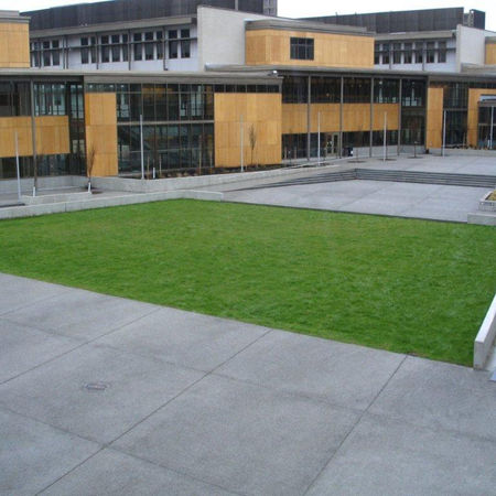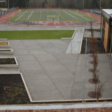 The new Issaquah High School building includes two and three story sections and provides 285,500 square feet of academic, athletic and performing arts space on a 54 acre site. The courtyard has 20,000 square feet of pervious concrete on two levels with a unique joint design transferring down the levels.